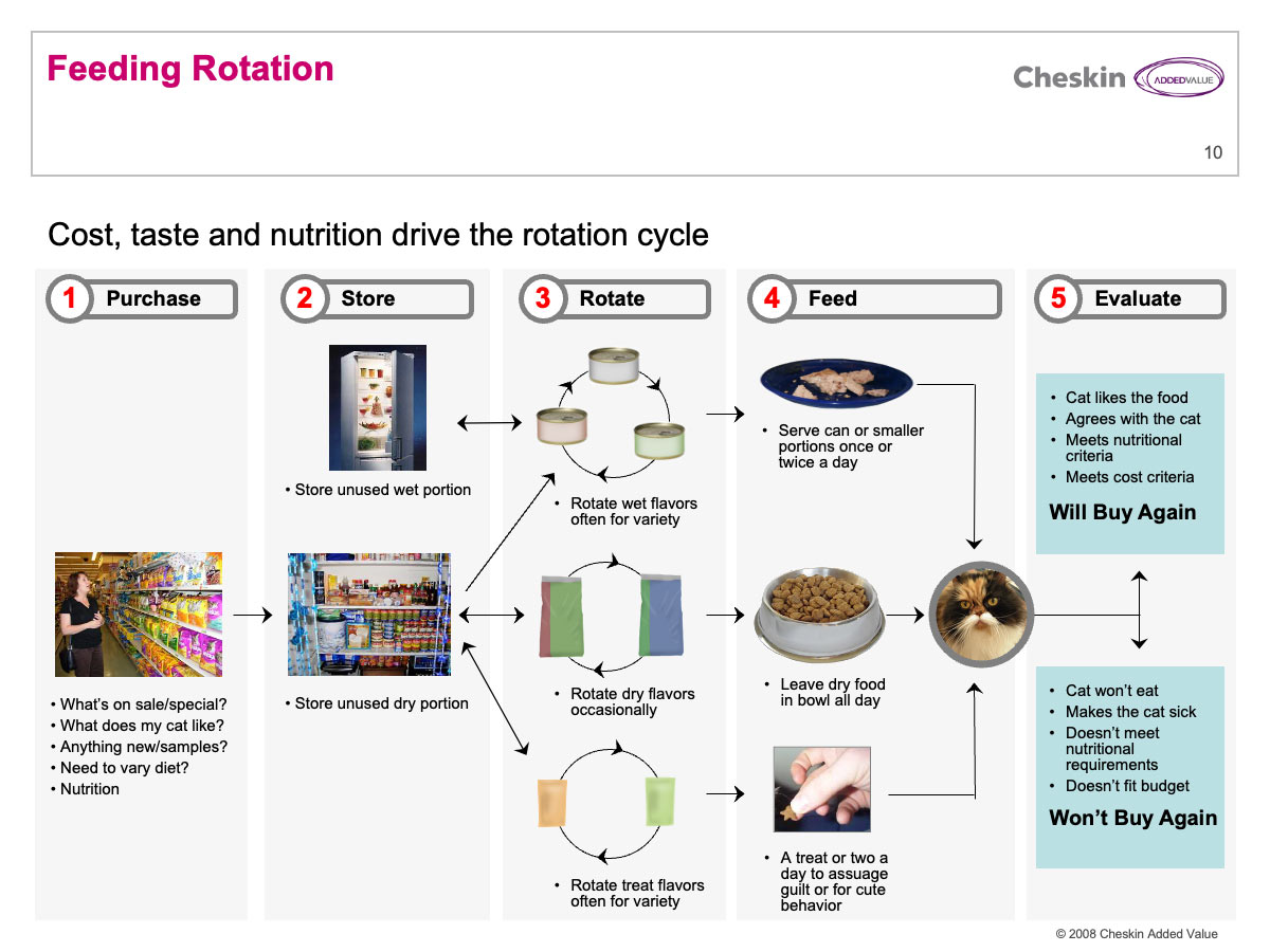 Information graphic indicating the process by which a segment of cat lovers experience food products for their pets.