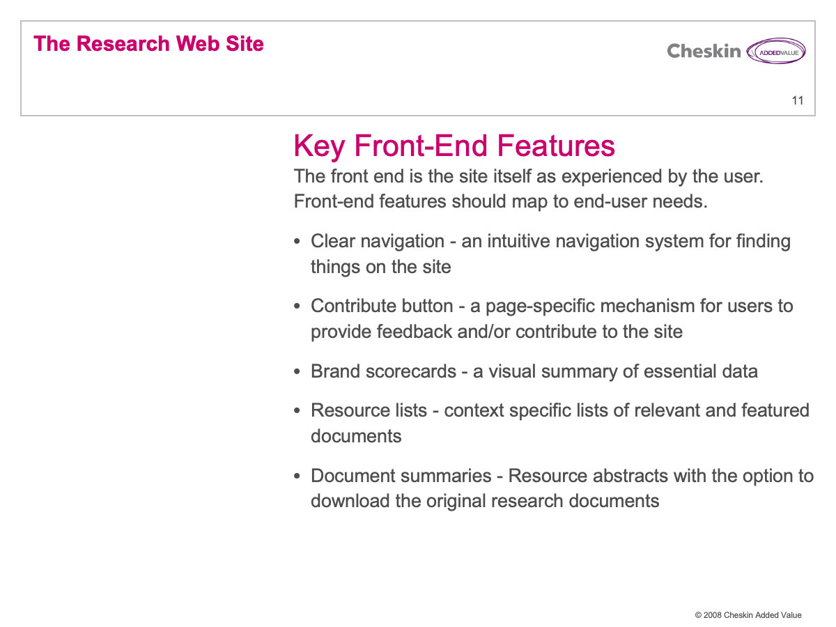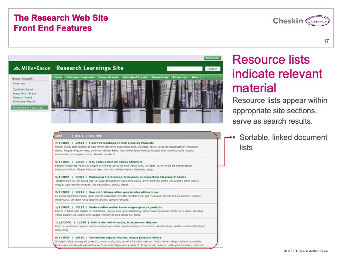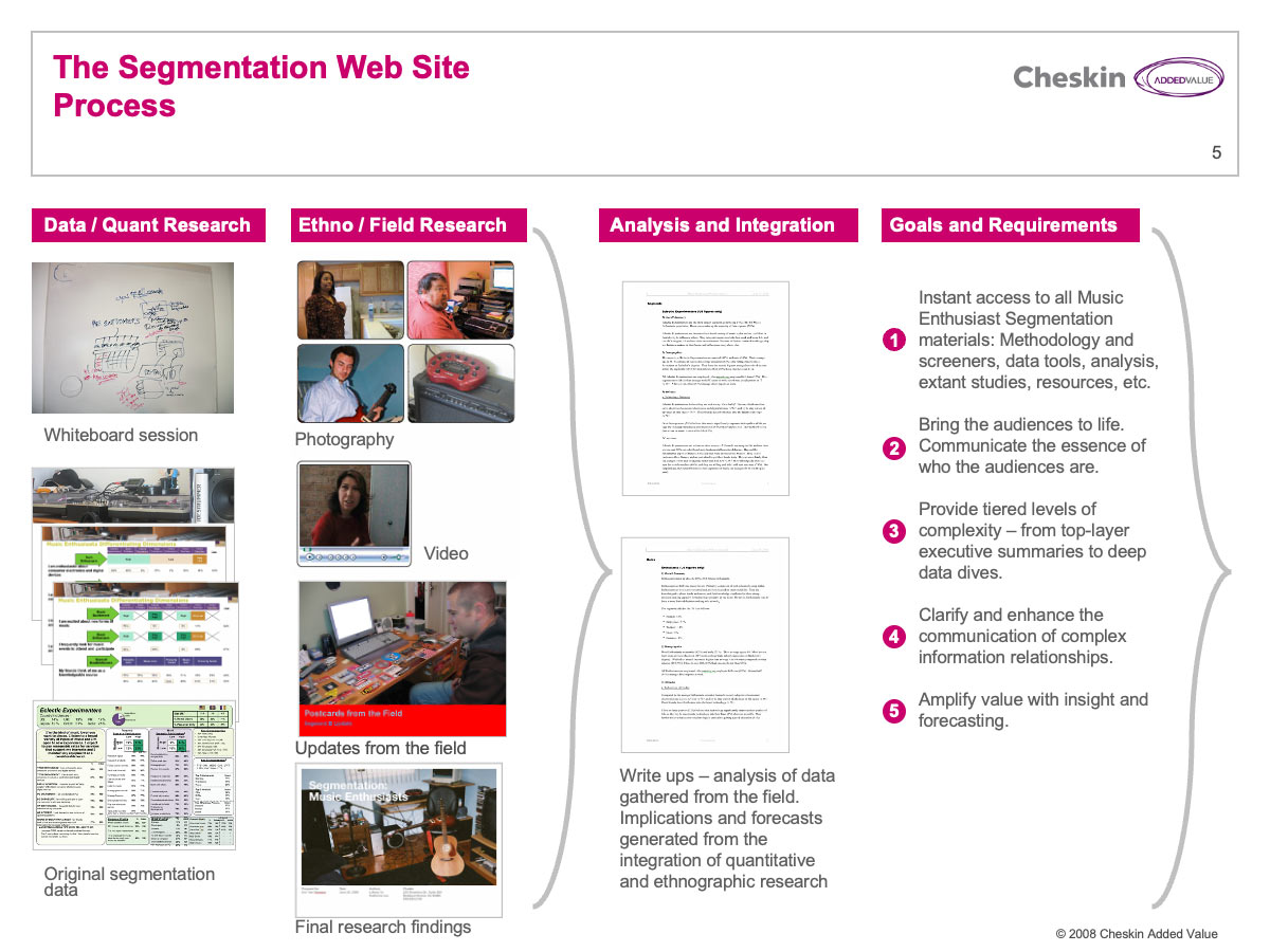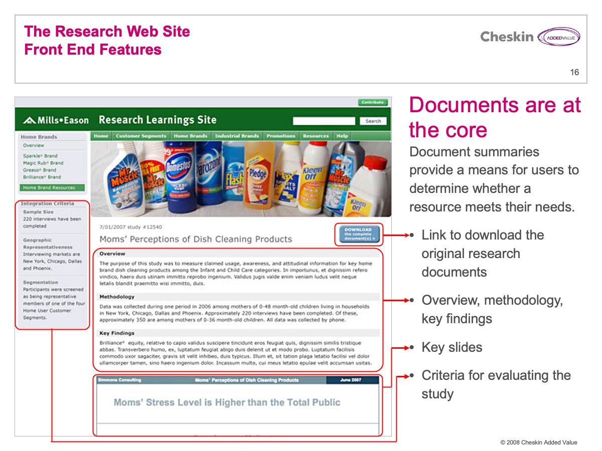 Many Cheskin clients invested a great deal of financial resources in market research. These reports were often delivered in lengthy PowerPoint and PDF files. Few companies have any efficient process for delivering these documents and their associated learnings and strategy across an organization.