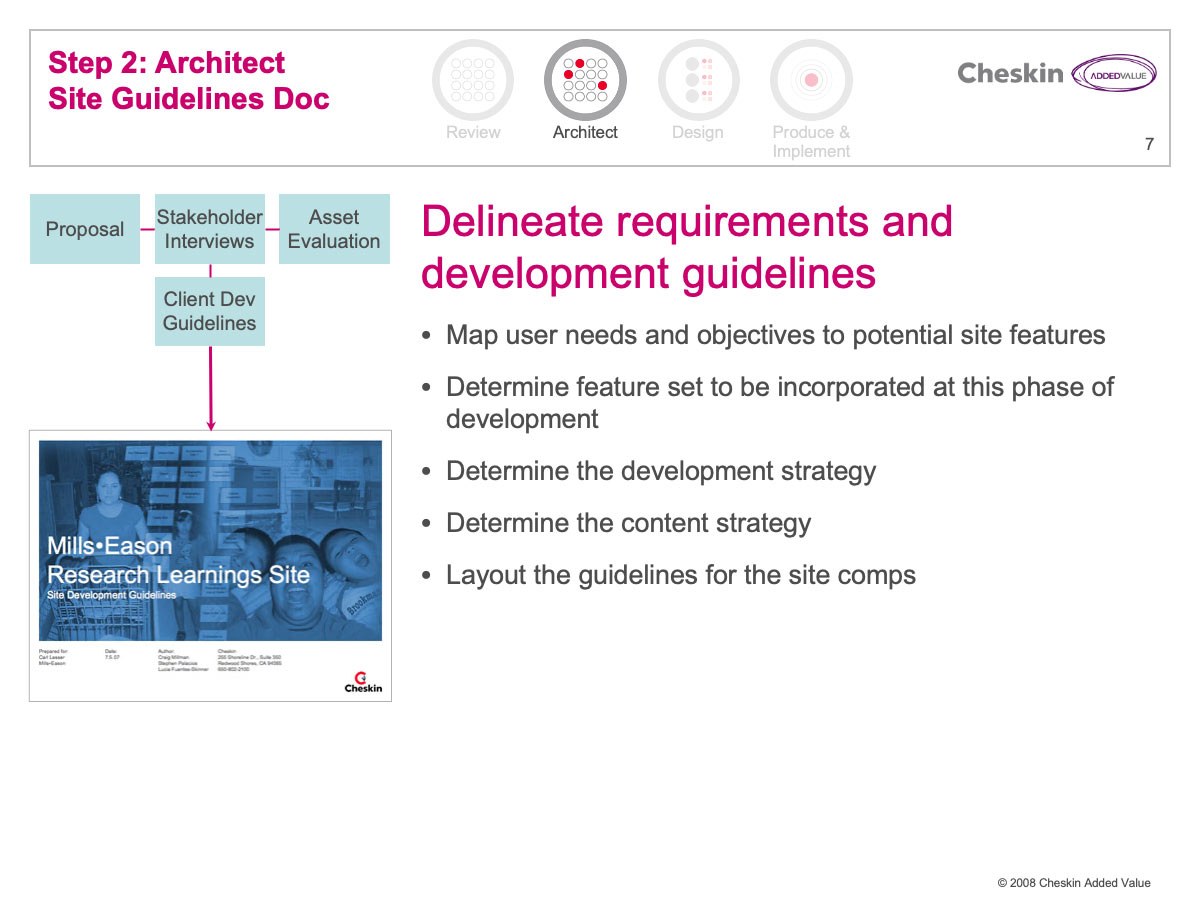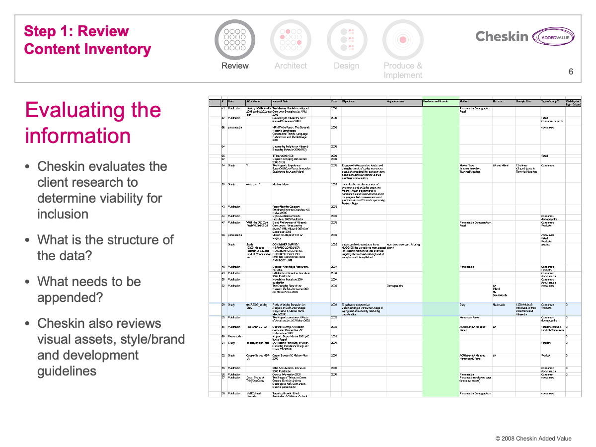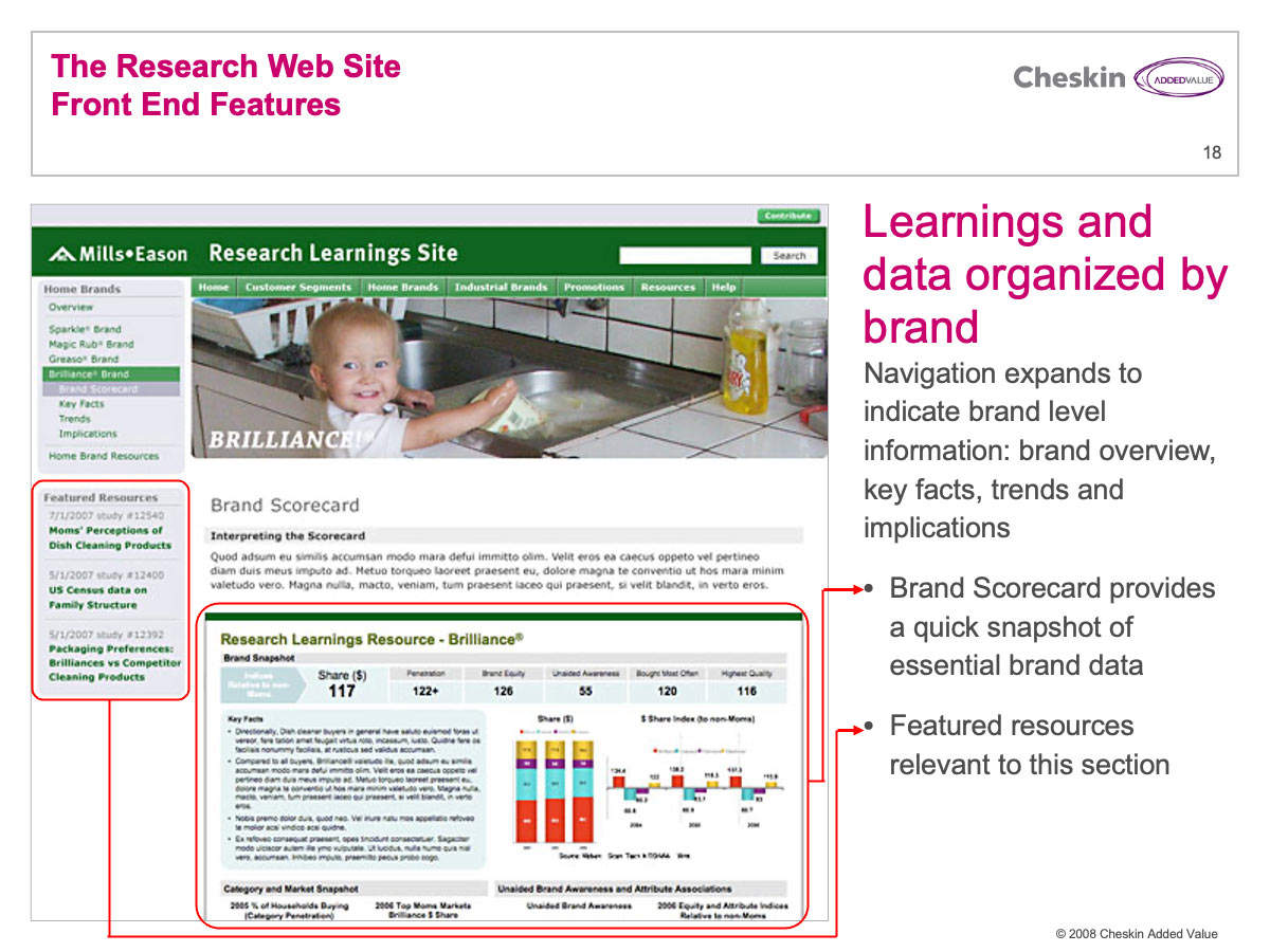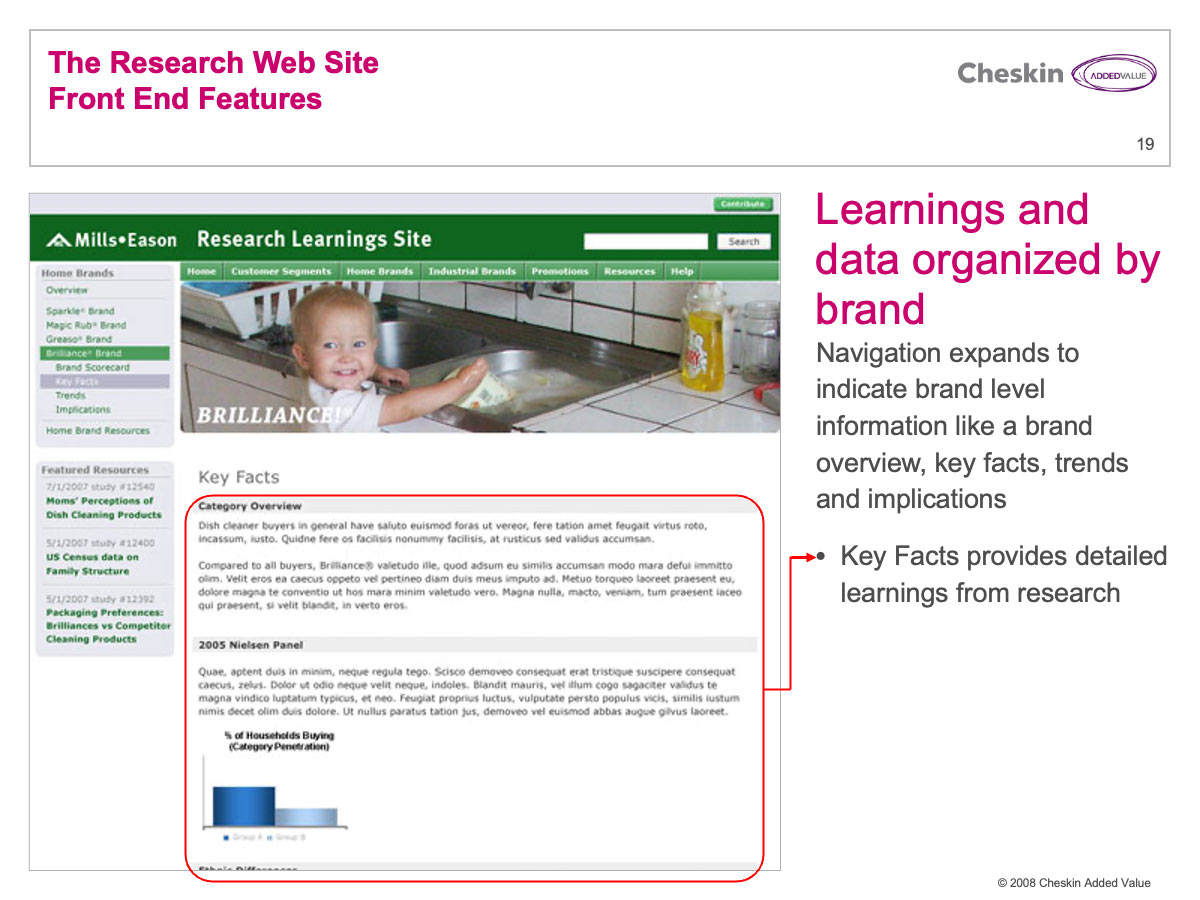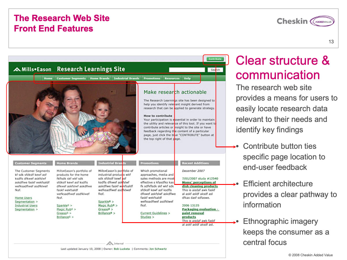 Many Cheskin clients invested a great deal of financial resources in market research. These reports were often delivered in lengthy PowerPoint and PDF files. Few companies have any efficient process for delivering these documents and their associated learnings and strategy across an organization.