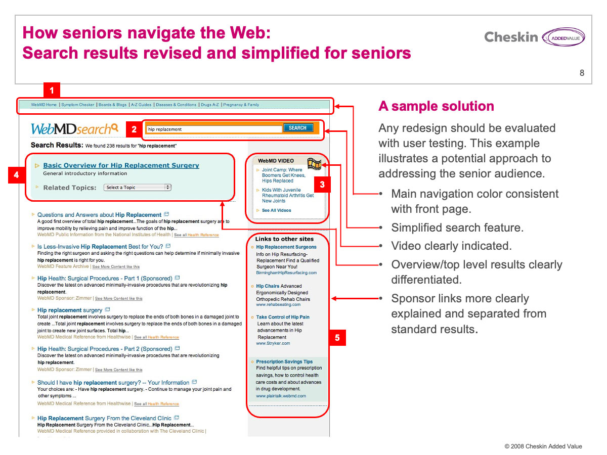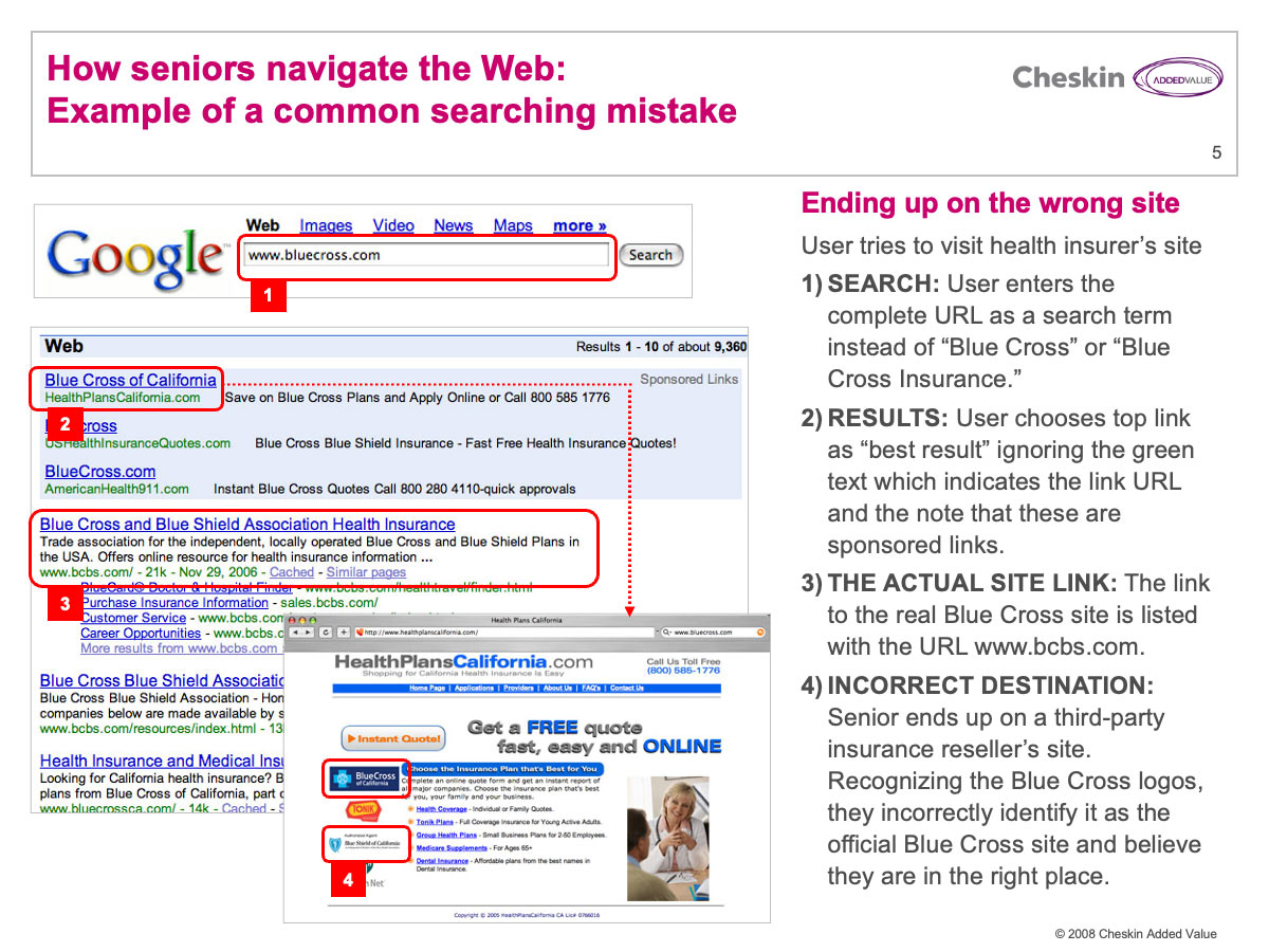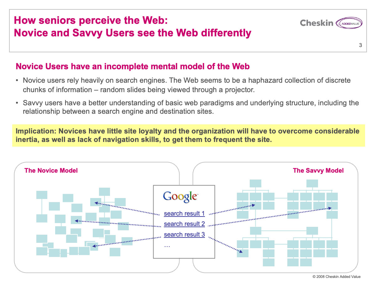 Information graphic explaining how seniors experience web search