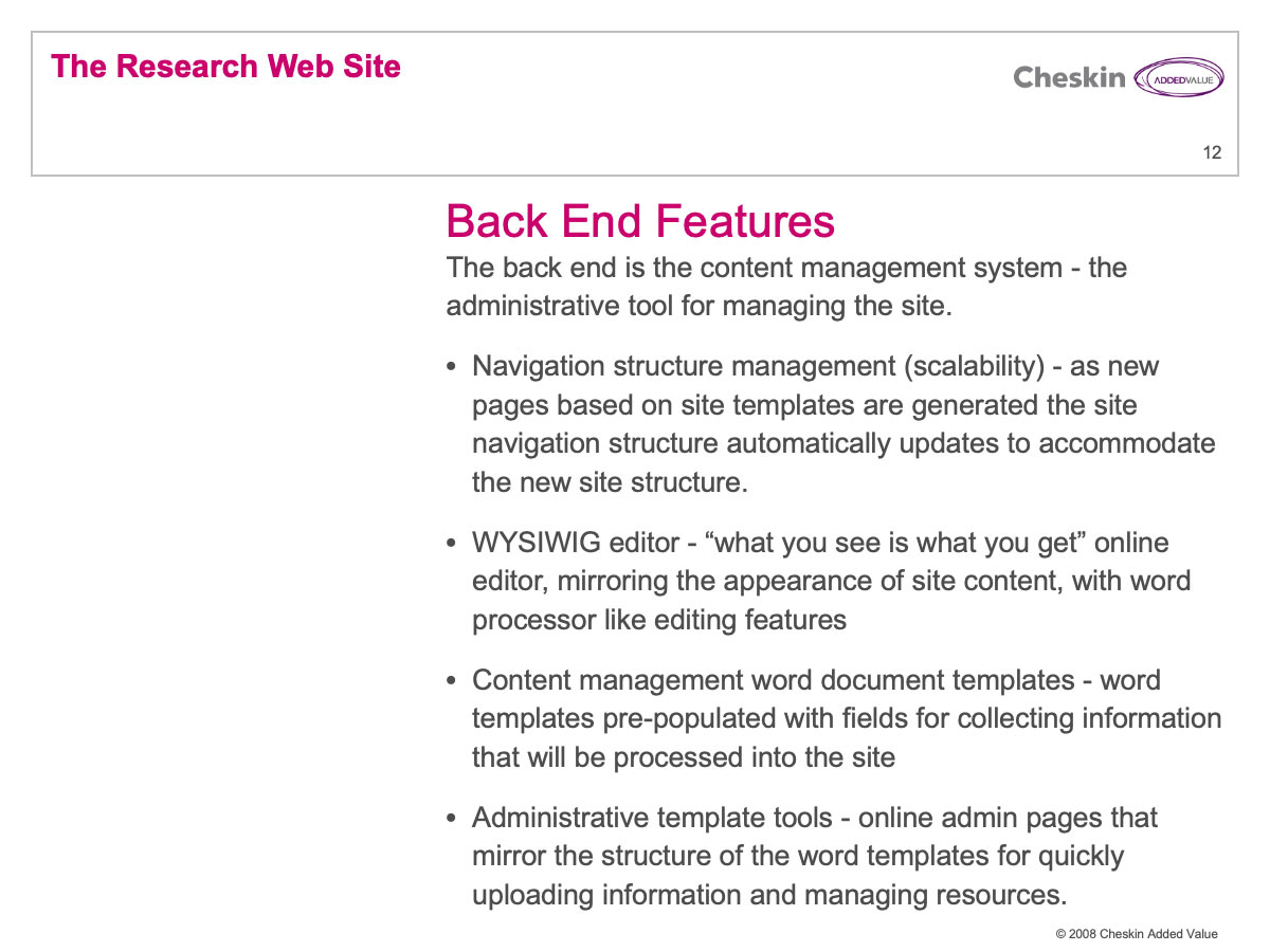 These portals were significantly more complicated to develop and featured an integrated, custom CMS solution. I personally led and executed these projects. These scrubbed slides are part of a guide I created explaining the process required to create the sites, the time-frame, effort and costs to add them on to a project.