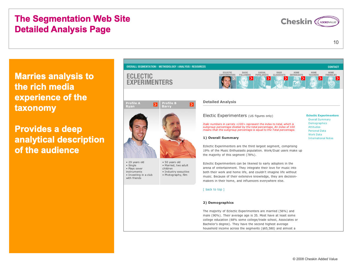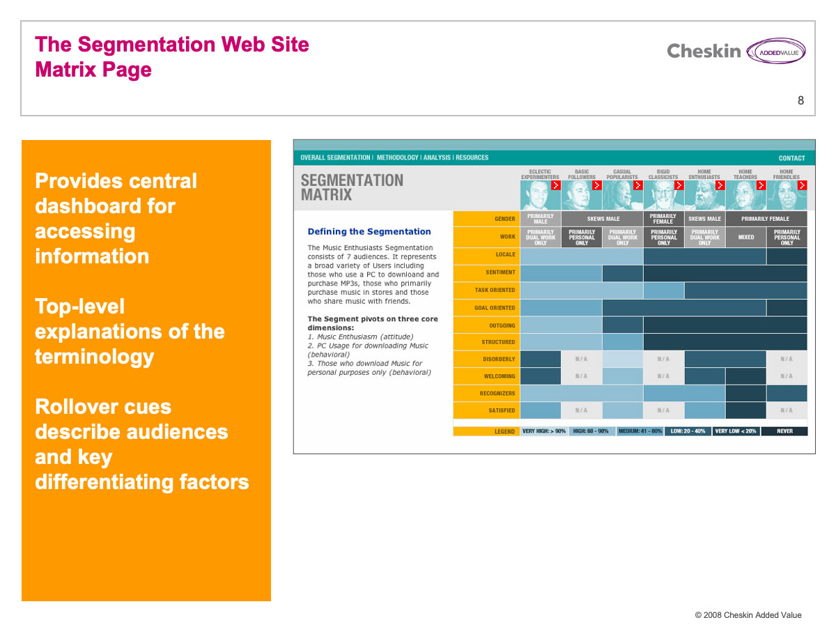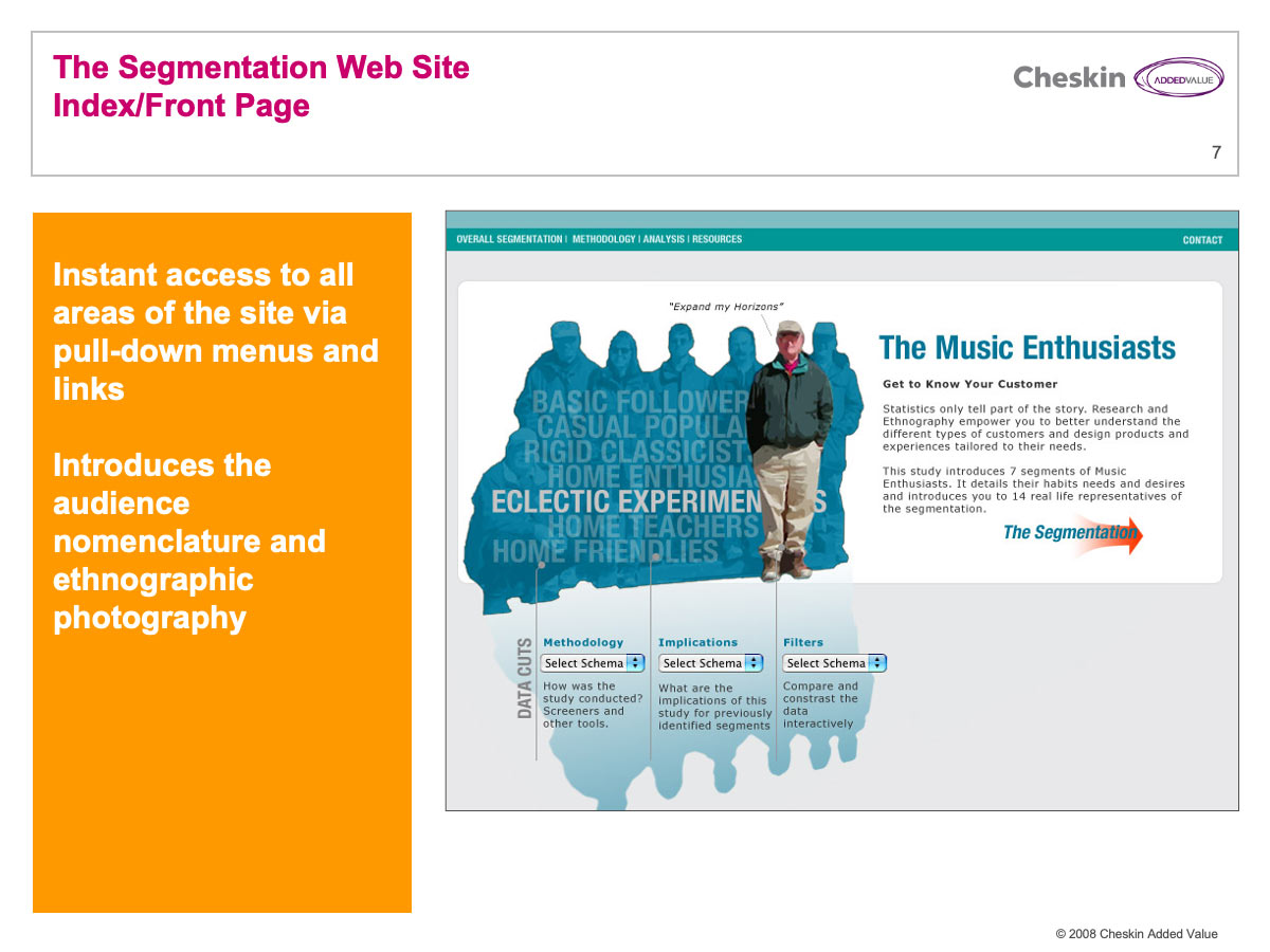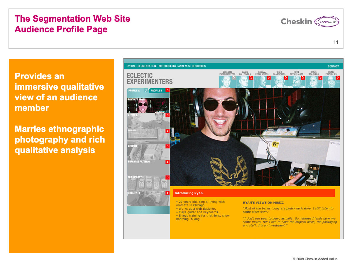Segmentation websites are brochure-style, simple websites designed to provide the user with a rich-media experience of individual segments. I developed sites that provided an overview of the segmentation and a deep experience of representative consumers. These were enriched with a wealth of photography and video gathered in field.