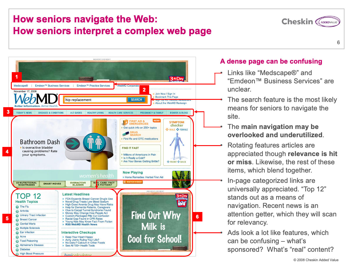 Information graphic explaining how seniors experience complex web pages