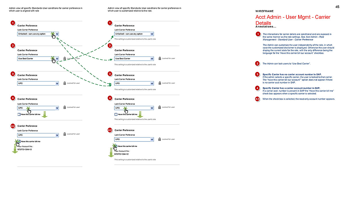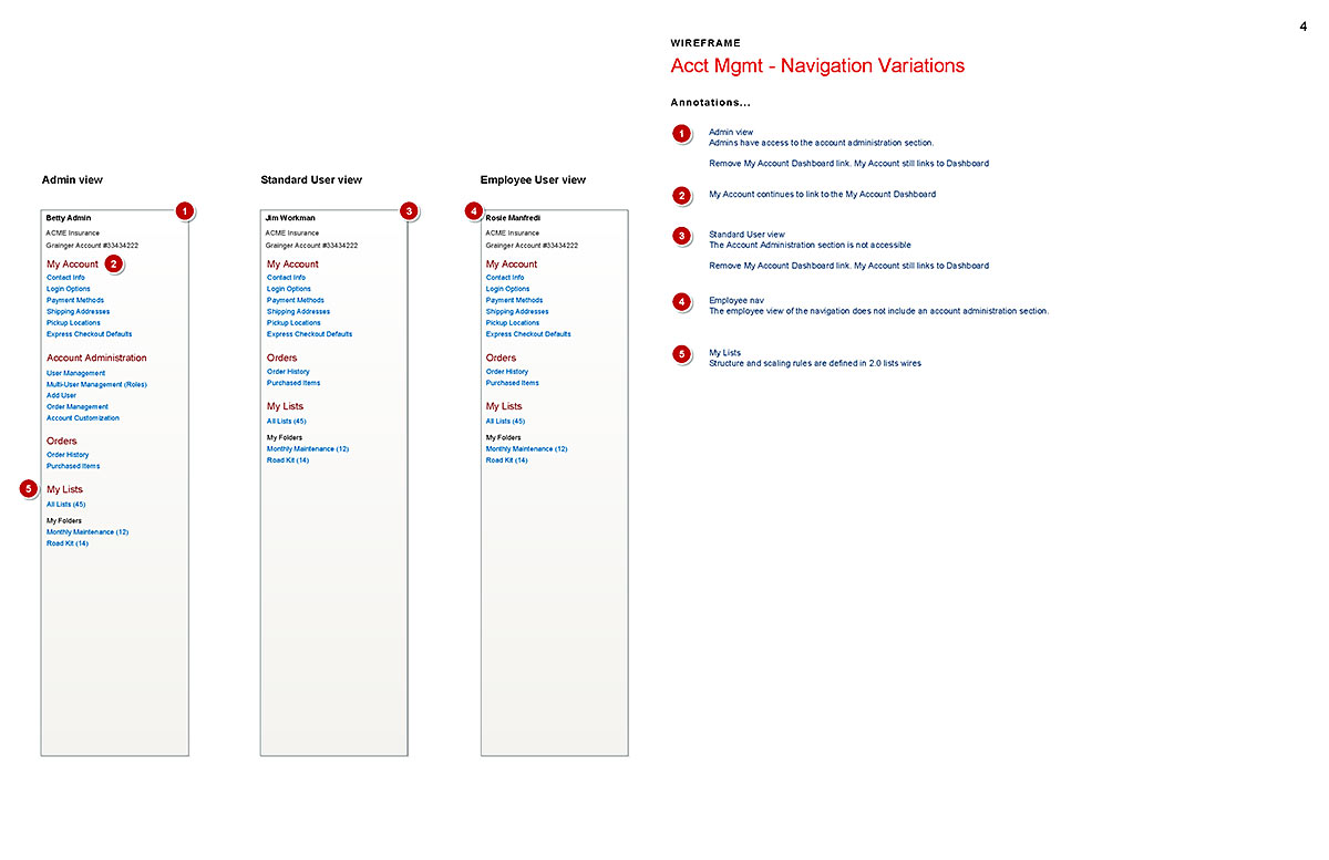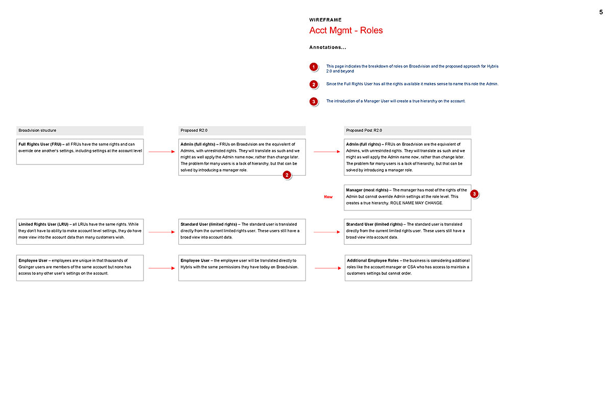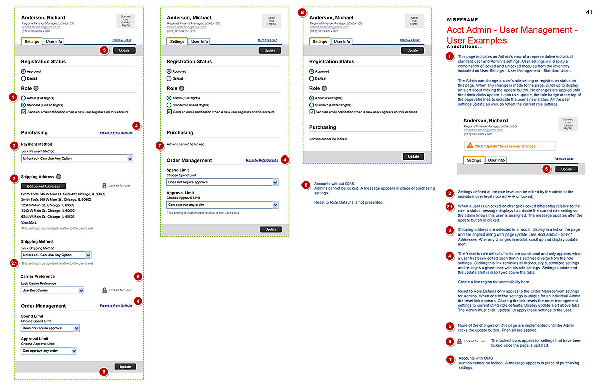 The wireframe process for the OMS experience was a best practices process. We began by defining the role structure for the account section of the website. Our larger customers wanted to control employee behavior and spend on the site. In some cases they wanted to lock their employees to certain subsections of the catalog or shipping addresses. We defined that structure for the accounts.