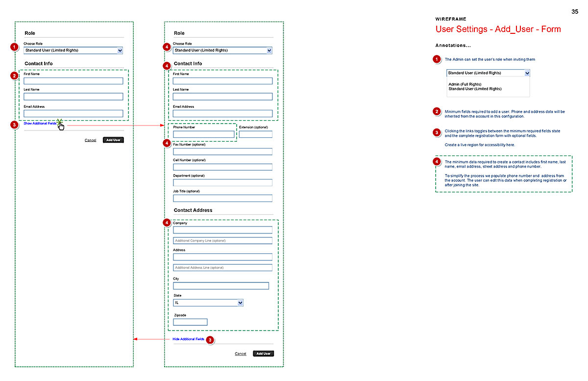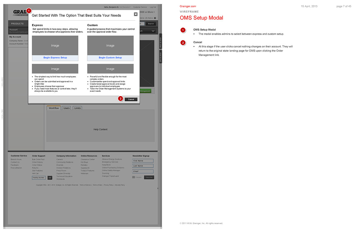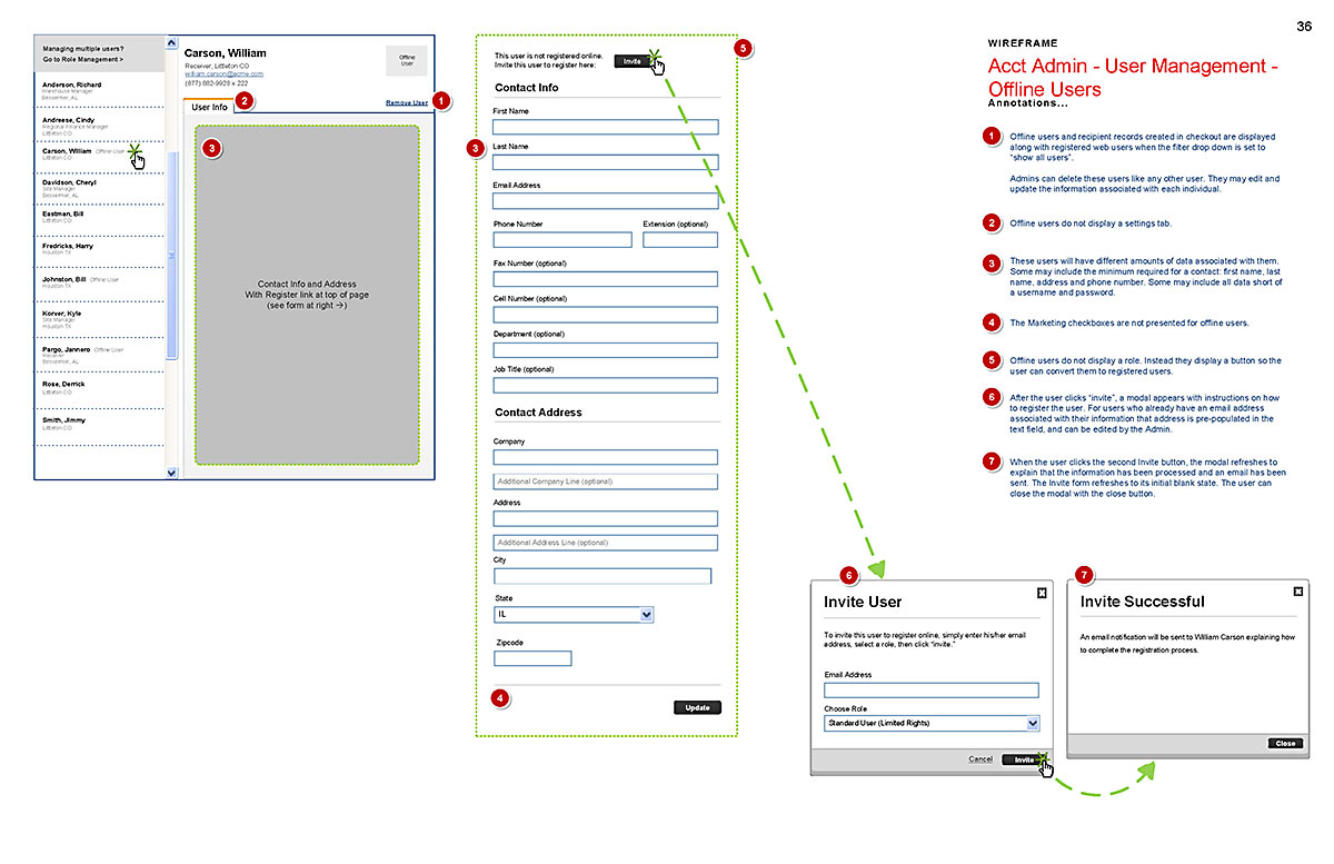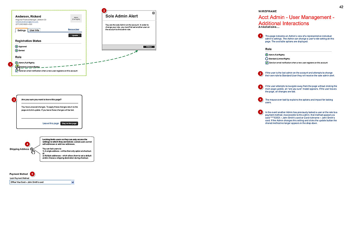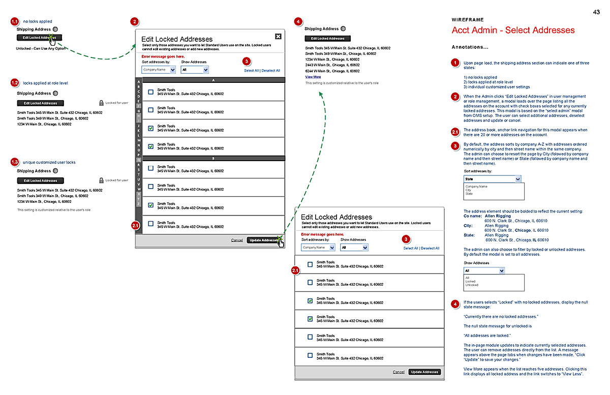 The wireframe process for the OMS experience was a best practices process. We began by defining the role structure for the account section of the website. Our larger customers wanted to control employee behavior and spend on the site. In some cases they wanted to lock their employees to certain subsections of the catalog or shipping addresses. We defined that structure for the accounts.