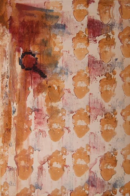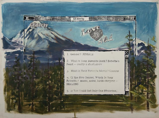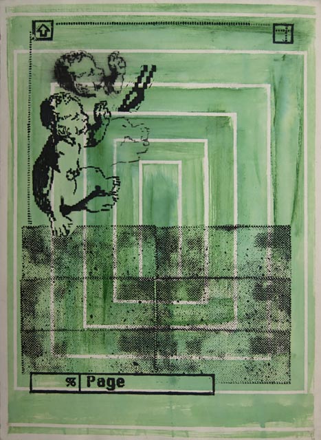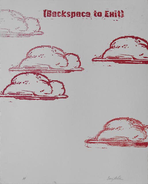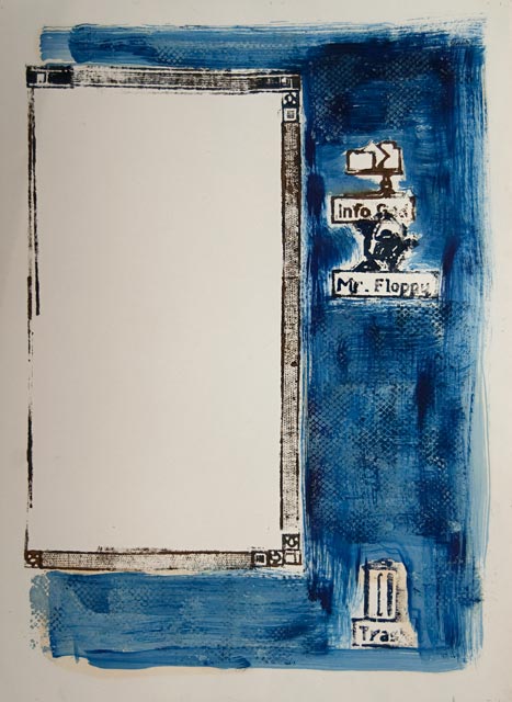 While I was painting I began earning a living through computer-based graphic design. Rather than focusing on esoteric ideas from art and literature I began to become fascinated by the computer interface itself and the relationship between virtual and real. I cut to-scale woodblocks of the computer interface that enabled me to explore the gestures of computer interaction in a physical realm. |